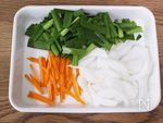 豚しゃぶ肉スライスは食べやすい大きさに切る。 玉ねぎはスライス、にんじんは千切りに、にらは5cm幅の長さに切る。にんにくはすりおろす。 |