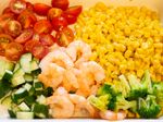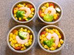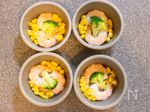 アルミカップ(又はシリコンカップでも)に写真のようにサラダ用ボイルえびやコーンなどを入れる。 | |
