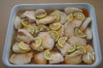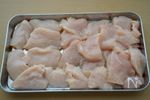 バットに(3)の鶏肉を入れ、すだちを加えて漬け込む。 冷蔵庫に入れて味を馴染ませる。 |