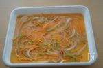 玉ねぎは薄切り、にんじんとピーマンは千切り、赤唐辛子は小口切りににする。 すだちは2個を絞り、残りは半月切りにしておく。 |