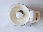 フードプロセッサー(ミキサー)に木綿豆腐、A メープルシロップ 大さじ4、ココナッツオイル 大さじ3、レモン・果汁 大さじ1、白味噌 小さじ1 を入れ滑らかになるまで攪拌する。約5分ほど、攪拌すると、写真のように滑らかになる。 |