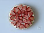 6号サイズスポンジケーキは元々2つに分かれているので、1つにクリーム、スライスしたいちご、クリームの順に重ねる。 | |
