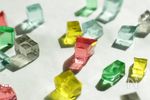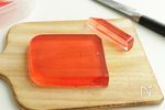 固まった寒天をとりだし、包丁でカットするか 手で割って食べやすい大きさに分割する。 揃えず、あえて形がばらばらになる方が鉱石っぽく仕上がる。 |