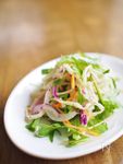 グリーンの葉物と人参や紫キャベツのコントラストが楽しいサラダです。