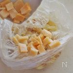 肉じゃがは汁けをきり、ポリ袋に入れてマッシュします。 パルミジャーノ・レッジャーノ・チーズは5mm角位に切ります。 |