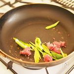ピーマンを食べやすい大きさに切ります。 熱したフライパンに少量の油をひき ピーマンとコンビーフを炒めます。 |
