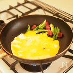 フライパンに溶き卵を流し入れます。 10秒程待ってから大きくかき混ぜます。 |