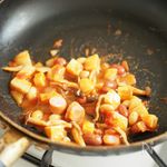 じゃが芋・玉ねぎ・ウィンナーを小さく切り熱したフライパンに 大さじ1の油をひいて炒めます。 トマトの水煮缶・大豆・シメジを加え、蓋をして中火で3分ほど煮込みます。 ソース・砂糖・塩コショウで味を調えます。 |
