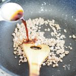 挽肉に火が通ったら、水で薄めた醤油を加えます(醤油1:水3の割合)。 | |