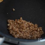 フライパンに挽肉を入れ、片栗粉をふりかけて炒めます。 | |