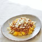 挽肉にとろみがついたら、モヤシと卵を炒めた上にのせます。 | |