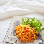 人参、柚子皮、A 酢 小さじ2、オリーブオイル 小さじ2、砂糖 小さじ1、塩 2つまみ を和えます。柚子果汁を絞り、刻んだアーモンドを加えて和えます。 |