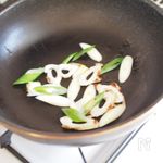 熱したフライパンにごま油をしき、 斜め切りにした竹輪とネギ・鷹の爪を炒めます。 |