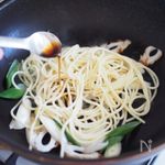 パスタを加えて軽く炒め、醤油を加えます。 | |
