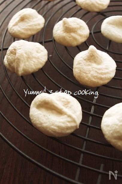余った卵白と砂糖で作れる、軽い食感の焼き菓子です。そのまま食べるのはもちろん、フルーツに添えたりアイスのトッピングにしたり。ホロッと崩れるようになるまで、低温でじっくり乾燥させるように焼くのがポイント。この食感はちょっとはまっちゃいます♪