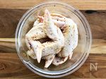 【下ごしらえ】 手羽先は骨に沿って切れ目を入れ、塩、こしょう、カレー粉を順番にもみ込んで薄力粉をまぶして10分おく。 |