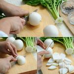 1・かぶは皮ごと、半分に切ってから3、4ミリにスライスします。葉っぱは3センチ幅くらいにカットします。 | |