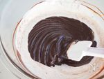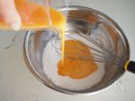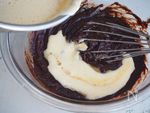 2⃣に4⃣の卵液を3回に分けて加え、ホイッパーで滑らかになるまで混ぜます。 卵液が入るにつれ、だんだんなめらかで柔らかくなってきます。全部加えるとサラサラと流れる状態になります。 |