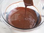 【チョコレートを溶かします】 用意した50度前後のお湯に、クーベルチュールスイート(62%)の入ったボウルを浸け、溶けるまでそのまま置いておきます。全体が溶けたらゴムベラで空気が入らないように混ぜます。 |
