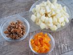 大きいままのドライフルーツを5mmほどの大きさに刻みます。洋梨は皮をむいて種を取り除き、1cm角にカットします。今回は食感を楽しむためにレーズンは刻まずに使います。 この段階でドライフルーツと洋梨の重さを計り、重さの半分の砂糖を準備します。今回は約500gだったので250gのグラニュー糖を使用しました。 |