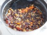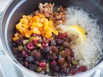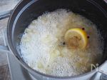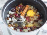 先に砂糖を入れてしまうと糖度が高すぎてなかまで染み込みません。ここではドライフルーツが水分を含むことが目的です。 次の工程で煮込む前にレモン果皮は取り出します。 |