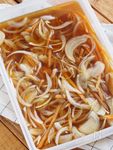 玉ねぎ薄くスライス、にんじんは千切りにして平らな保存容器に入れます。(玉ねぎの辛さが気になれば水にさらしてください) A 水 150cc、酢 150cc、砂糖 大さじ2、醤油 大さじ1.5、カレー粉 小さじ1/2 を小鍋で沸騰させ、粗熱が取れたら野菜が入った容器に入れます。 |