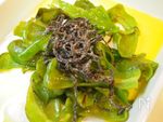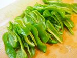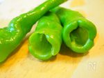 万願寺とうがらしを手で食べやすい大きさに割く。 (ヘタは親指で中に押し込むようにすると綺麗に外れます。そこから手で割きます) |
