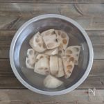 ●れんこんの皮をピーラーで薄くむき、乱切に B 水 400ml、酢 小さじ1 に5分漬けておく。色やアクが気にならない方は酢水につける工程は 省いてください。 |