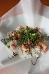 クッキングシートの上にご飯を乗せ、その上にマヨネーズを3カ所くらいに乗せて残りの材料を全て乗せて包む。 | |