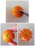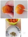 きんかんの上下の幅を少し残して茶せん茄子の様に果物ナイフでぐるっと1周切り目を入れます(先ず①の様に切込みを入れてから②で間に切り目を入れて8ヶ切り目を入れると切りやすいですよ。) | |