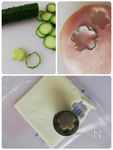きゅうりは板ずりして少し厚めの薄切りにし花の型で抜きます。 スライスチーズ、ハムも花型で抜きます。 |