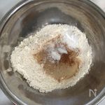 A 小麦粉 90g、きび砂糖 45g、ベーキングパウダー 小さじ1/2、重曹 小さじ1/4、塩 ひとつまみ、シナモン 小さじ1/2 の粉類をボウルに入れ、泡立て器でぐるぐる混ぜる。 |