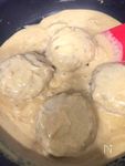[B]をいれたら中火にし、コンソメがとけたらハンバーグをフライパンにもどす。 ハンバーグにソースを絡めながら中火で5分煮たら完成! |