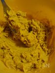 A 無調整豆乳 150cc、生クリーム 100cc、バニラエッセンス 10滴 を5回に分けて入れて混ぜ、かぼちゃとよくなじませる。くるみを加え混ぜる。 |