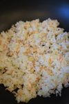 胡麻油をフライパンに入れて火を点け、A 長ねぎ 5㎝位、椎茸 1/2枚 を入れて香りが立つまで炒める。カニカマをほぐしながら炒め、続けてヤマキ 割烹白だし焼きあご仕立てを入れ、全体を合せる。 1分ほど炒めて水分を飛ばしたら、ご飯を加えて全体が混ざり合うよう炒める。中のチャーハンはこれで完成です。 お皿の中心に高さが出るよう盛る。 |
