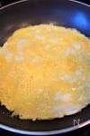 温まったフライパンに卵液を流し入れ、全体をサッとかき混ぜたら火を消してしまえば、焼きすぎる心配がありません。