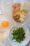 大葉は洗い、水気を拭いて縦に4等分し、重ねて細かく切る。 卵は卵黄と卵白に分け、卵白はポリ袋へ。(卵黄は最後に乗せるので、ラップをかけ、使うまで冷蔵庫に入れておいてください。) |