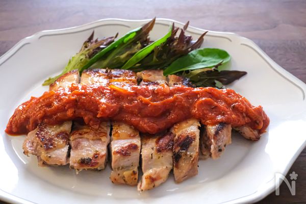 チキンソテーを食べやすく切って皿に盛り、肉の上にトマトソースをかける。お好みでルッコラなどを添える。