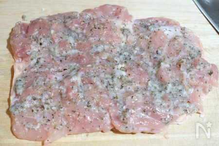 ②皮側に塩をふってもみ込み、身側に塩麹・バジル(乾燥)・ブラックペッパーを混ぜて塗り込み、冷蔵庫で30分ねかせる。