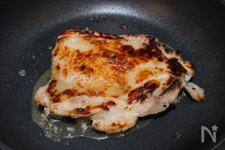 4.別のフライパンにオリーブオイルを熱し、鶏肉の皮面を下にして入れる。弱めの中火でこんがりと焼き色がつくまで焼く(目安:10分)。その際に出てくる油はキッチンペーパーでふき取る。