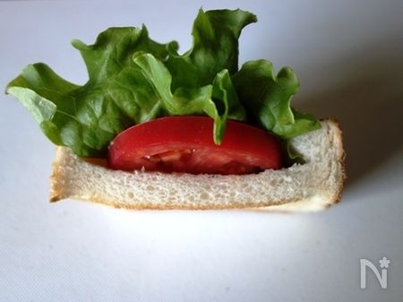 2. パンの切り込みにレタス、トマトの順に入れていきます。レタスはプリーツレタス、サニーレタスなどお好みのものでOKですが、細かく縮れている葉の方が見栄えがいいです。