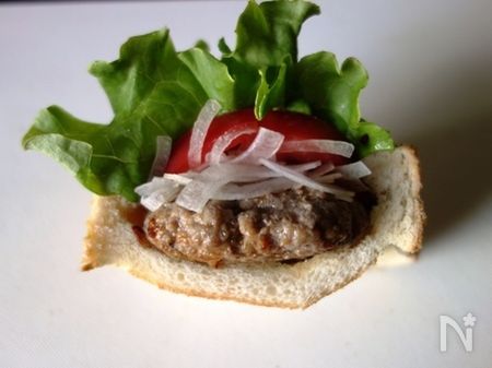【材料(1人分)】 ・合びき肉 100g ・レタス・トマト 各適量 ・玉ねぎ(スライス) 少々 ・食パン(4枚切り) 1枚 ・塩 ひとつまみ ・こしょう 少々