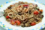 茹で上がったパスタと取り置いたシーフードを弱火にかけたフライパンで合わせ混ぜる。 器に盛りパセリとチーズを散らします。 |