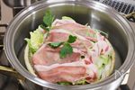 ざるにキャベツ→レタス→長ネギ→豚肉→三つ葉の順に重ねて鍋に入れて蓋をして蒸す。 | |
