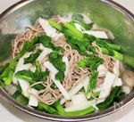 ボウルに蕎麦と菜の花・長芋を入れて混ぜ、器に盛る (写真はトッピングに花形の人参をのせましたがお好みでOK) |