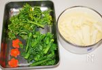 お湯を沸かしたり、蕎麦を茹でている間に菜の花を食べ易い大きさにカットして茹でる 山芋は細切りにして酢水に浸けておく (写真はトッピング用の人参を花形にくり抜いて茹でましたがお好みでOK) |