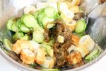 揉んだキュウリは水分はしっかり絞ってから和えます!