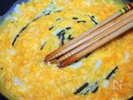 ボウルにB 卵 2個、砂糖 大さじ1、塩 少々 の材料を入れて混ぜてから、サラダ油を敷いたフライパンに入れて、菜箸でかき混ぜながら、そぼろにする |