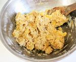 卵を別のボウルで溶いて、②に加えて混ぜ、B くるみ 30g、オレンジピール 100g、牛乳 大さじ2 の材料も加えてさらに混ぜる |