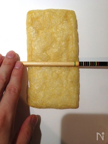菜箸で油揚げの上を2~3回転がすことではがれやすくなり、きれいな袋状にすることができます。そうすることで、酢飯を包みやすくなりますよ。
